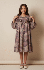 Its subtle mix of taupe, blush, and muted green tones gives a graceful vintage appeal, making it ideal for boutique photoshoots, festive wear, or seasonal gatherings.