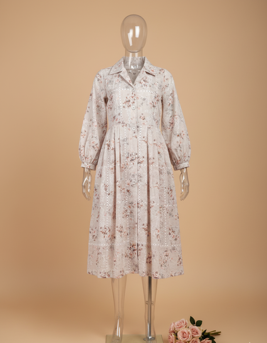 The Blush Garden Button-Down Dress captures timeless grace with its delicate floral print and lace-trimmed panels.
