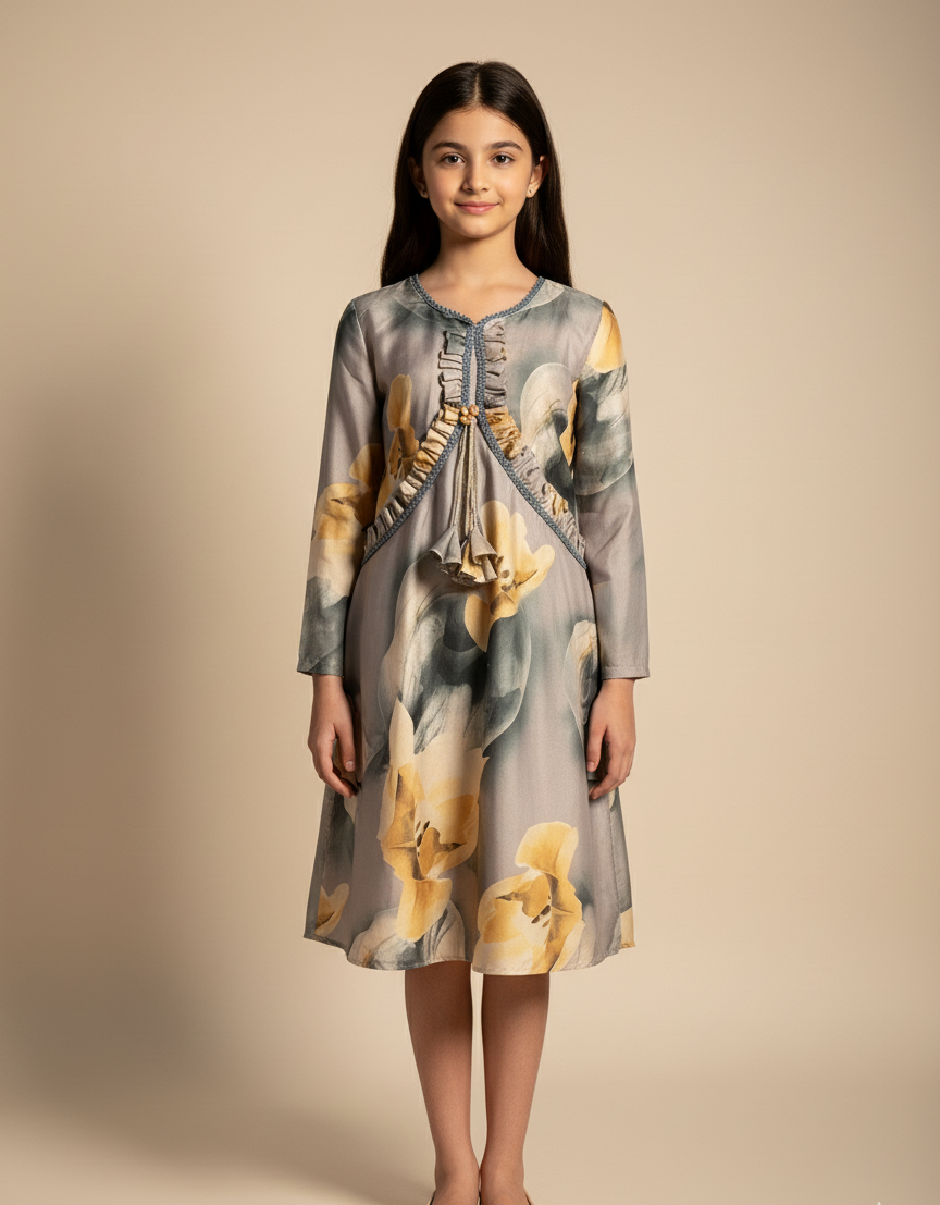 Golden Bloom Petal Dress – Elegant Gray and Yellow Floral Boutique Dress for Girls