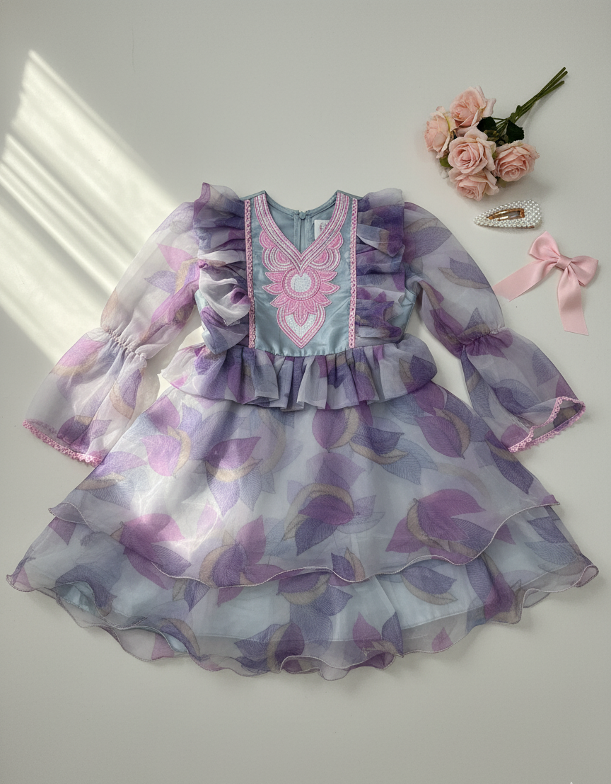 Lavender Bloom Embroidered Dress – Sheer Organza Princess Outfit for Girls