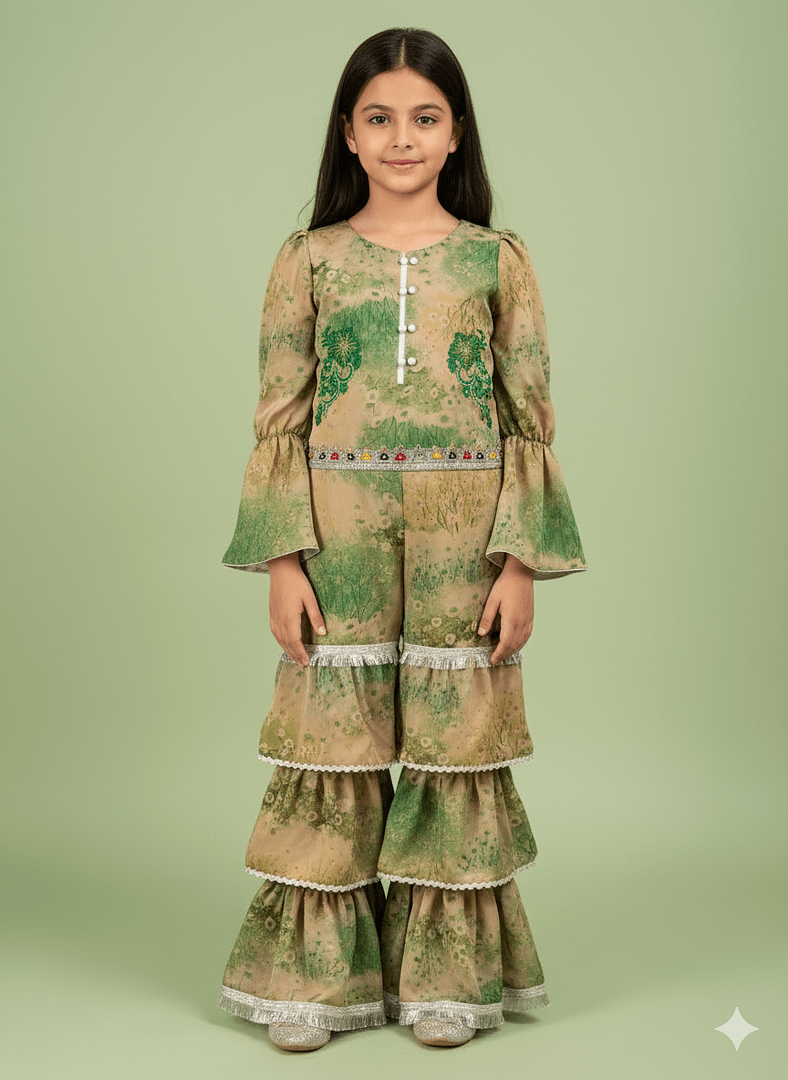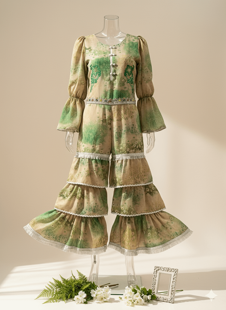 Crafted from soft printed chiffon with a satin lining, it features three-tier flared bottoms, puffed sleeves, and delicate green embroidery across the bodice — finished with a shimmering beaded waistband for added charm.