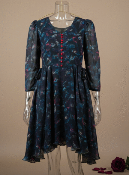 Midnight Bloom Dress – Dark Floral Chiffon Dress with Red Button Detailing