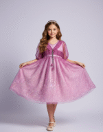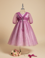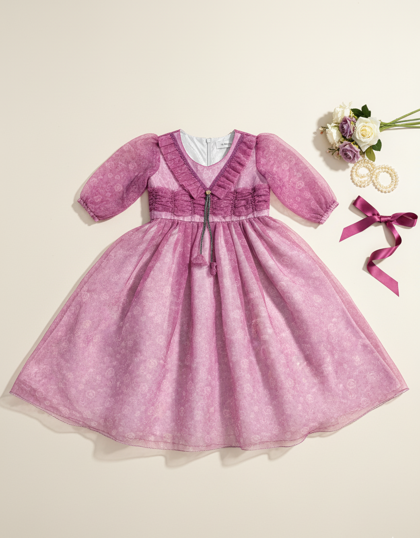 Designed for her fairytale moments, the Roselle Dream Organza Dress captures elegance in every detail. With soft pink floral layers, a ruched magenta waist, and puffed sheer sleeves, it’s the perfect blend of grace and whimsy.