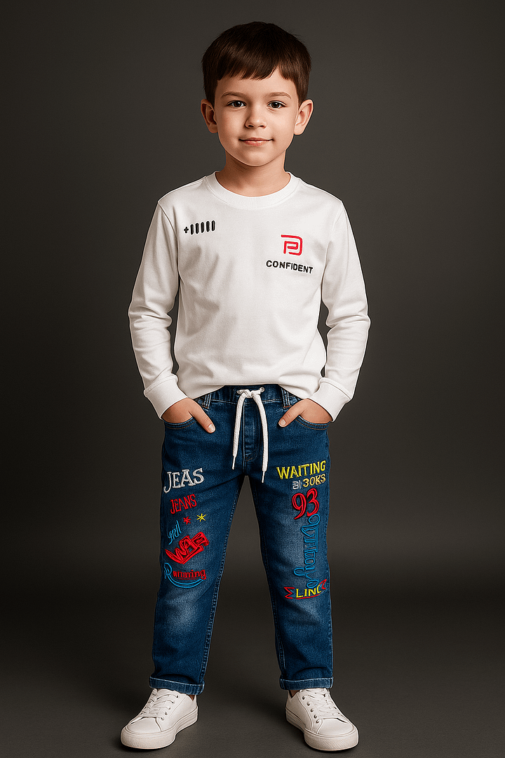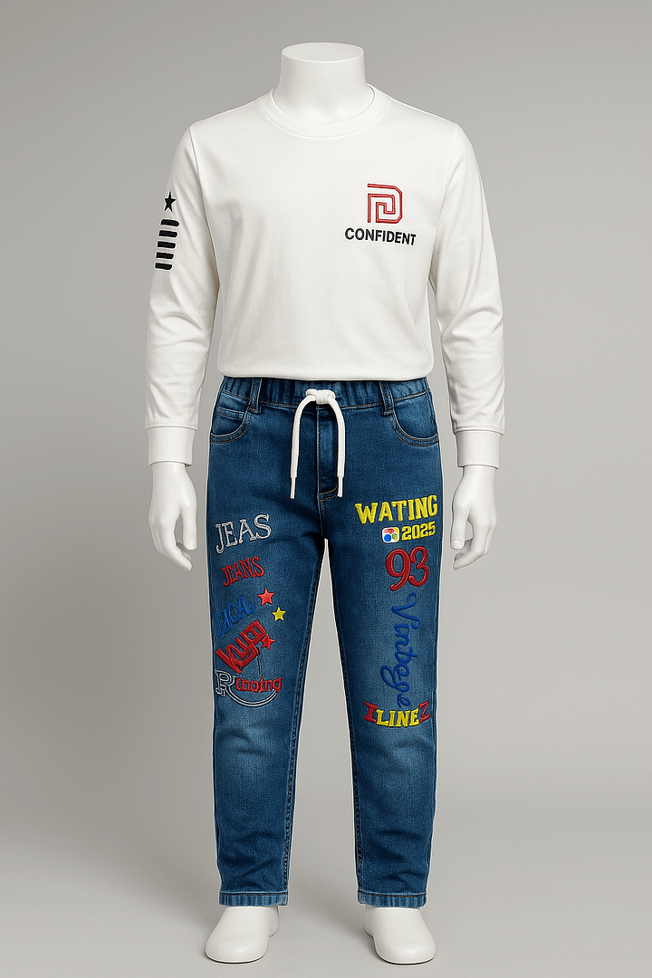 This boys’ two-piece set blends effortless confidence with everyday wearability — featuring a crisp white long-sleeve tee with bold “Confidence” logo detailing, paired with deep blue embroidered denim joggers for a statement look. Designed for active, stylish days.