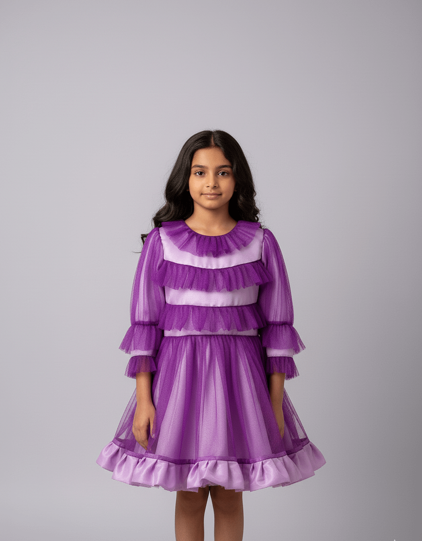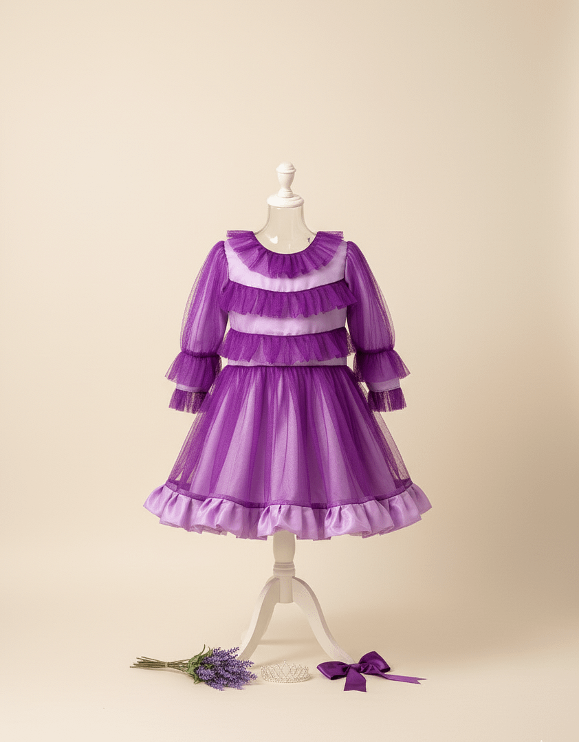 Crafted from lightweight layers of soft violet tulle over a silky lilac base, it features cascading ruffles, puffed sleeves, and a flared skirt that dances with every step.