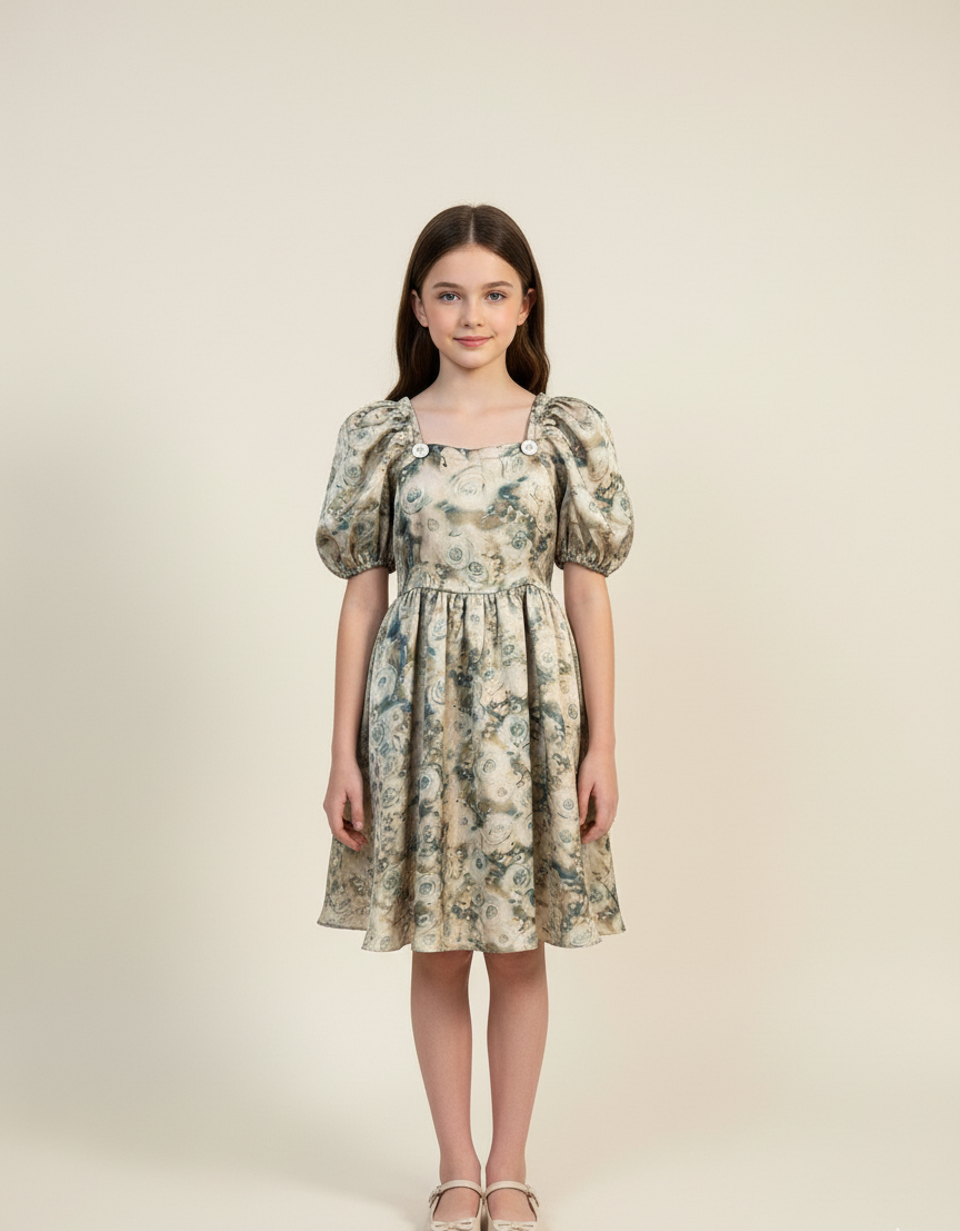 Crafted from airy, lightweight fabric with watercolor rose motifs in mint and teal hues, it features voluminous puff sleeves, a gathered waistline, and a flowy skirt that captures light movement beautifully.